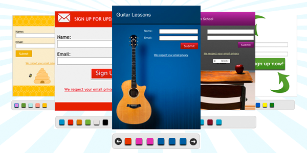 Un collage de formularios de inscripción coloridos, incluido uno para lecciones de guitarra. Cada formulario tiene campos para el nombre y el correo electrónico, y un botón de envío. Las opciones de diseño se muestran en la parte inferior, creando una combinación armoniosa perfecta para cualquier entusiasta de los instrumentos.